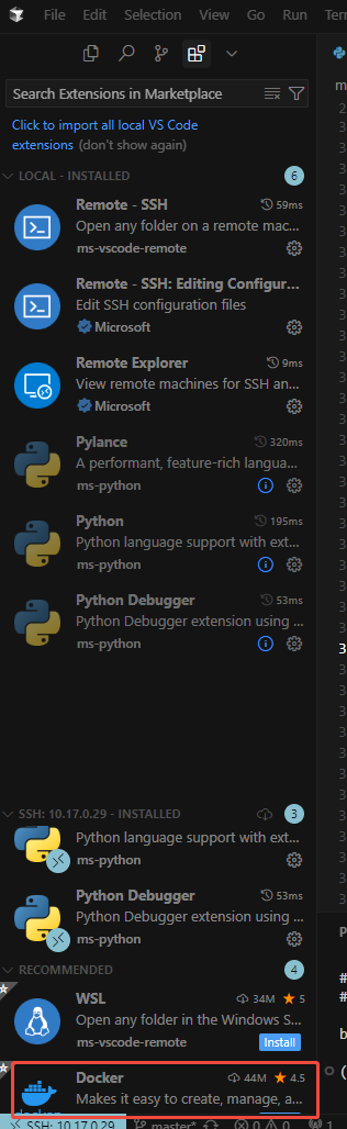 通过上述远程环境配置,我们了解到,在cursor中,插件(扩展)是很有用的。其实还有很多有用的插件,比如远程服务器使用了docker环境,cursor会提醒你是否安装这个插件,如下提示: