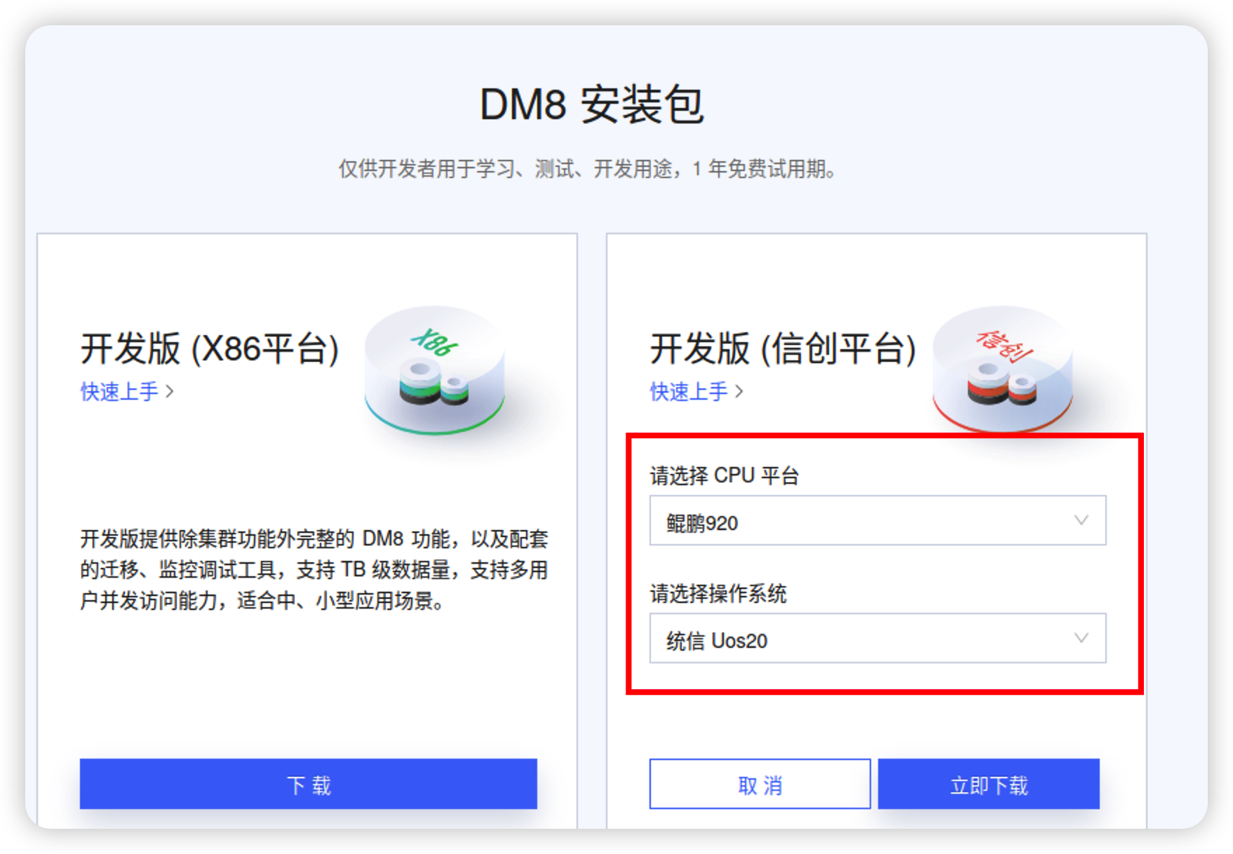 - 版本选择逻辑:进入下载页面后,选择“开发版(信创平台)”,CPU平台勾选“鲲鹏920”(兼容ARM架构),操作系统选择“统信Uos20”(适配Ubuntu系统),最终下载开发版本(提供除集群外完整功能,支持TB级数据量,免费试用1年,满足中小型开发场景需求)。