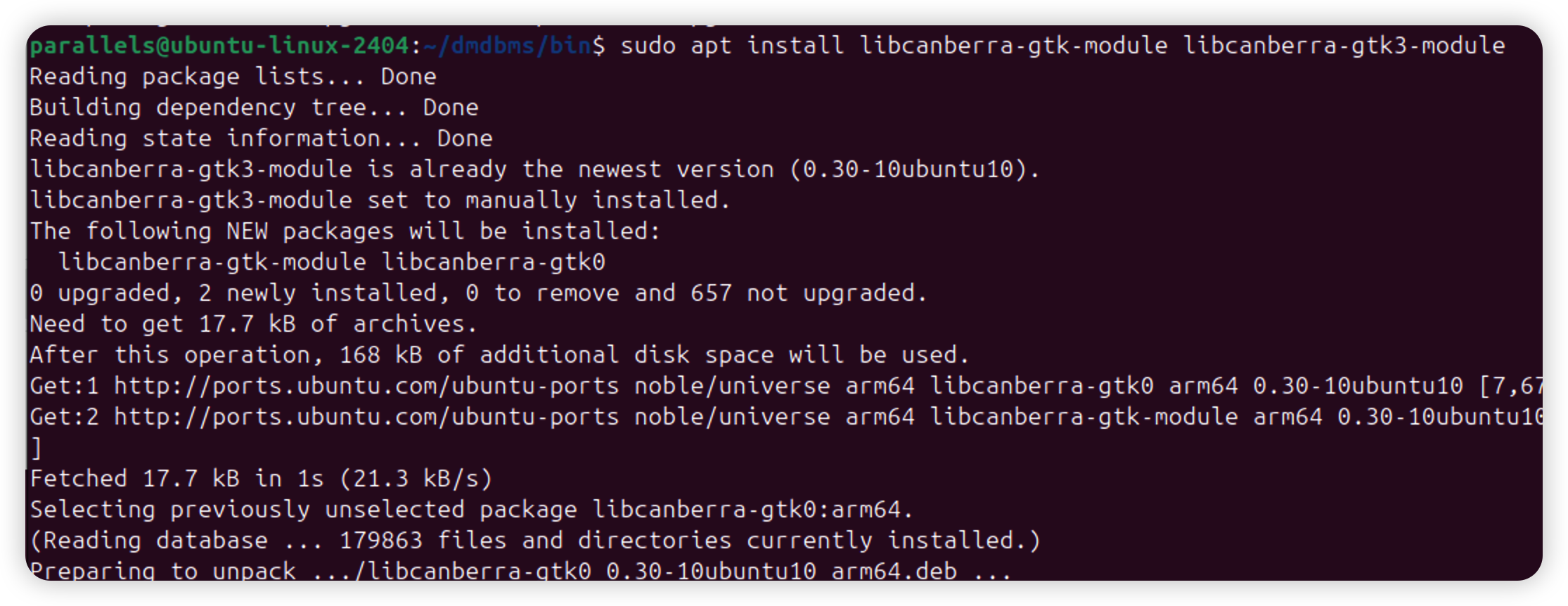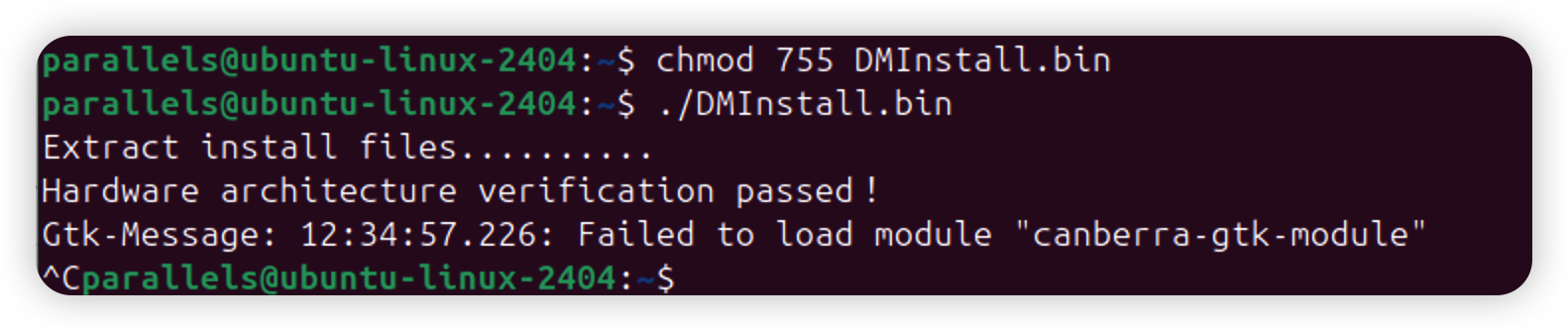 若尝试图形化安装(直接执行./DMInstall.bin),可能出现“Failed to load module ‘canberra-gtk-module’”报错,原因是Ubuntu系统缺失GTK依赖模块。