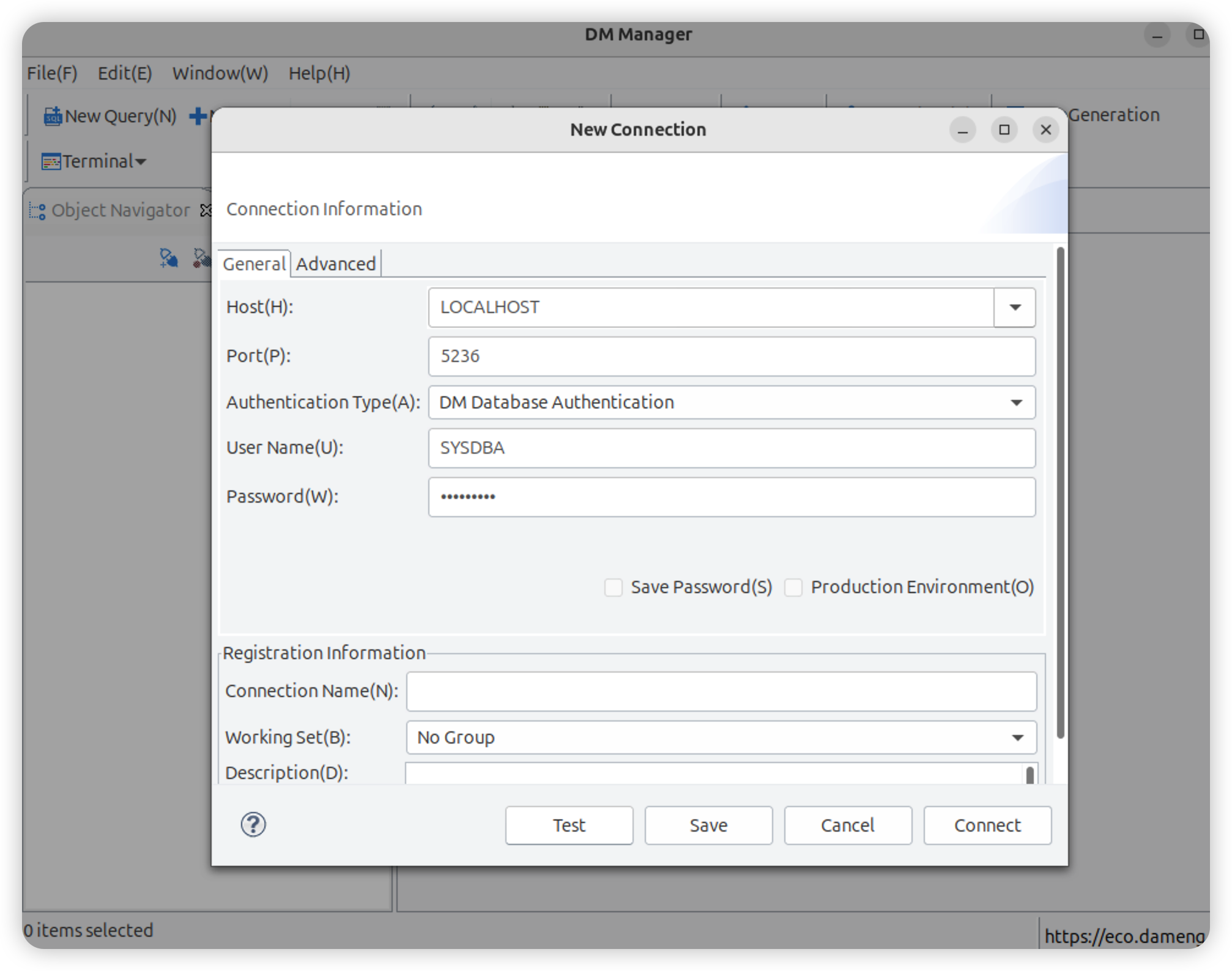 启动后,新建连接,输入主机地址(LOCALHOST)、端口(默认5236)、用户名(SYSDBA)及密码(Dameng123),即可完成可视化管理。