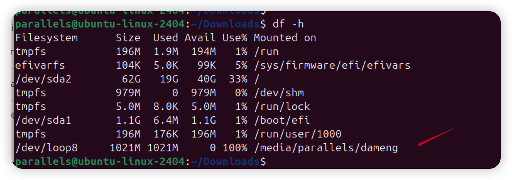 挂载完成后,用df -h命令就能查看挂载情况,确认一下镜像是不是挂载到了/media/parallels/dameng目录(每个人的环境可能不一样,以自己实际路径为准)。我这里的挂载成功界面是这样的: