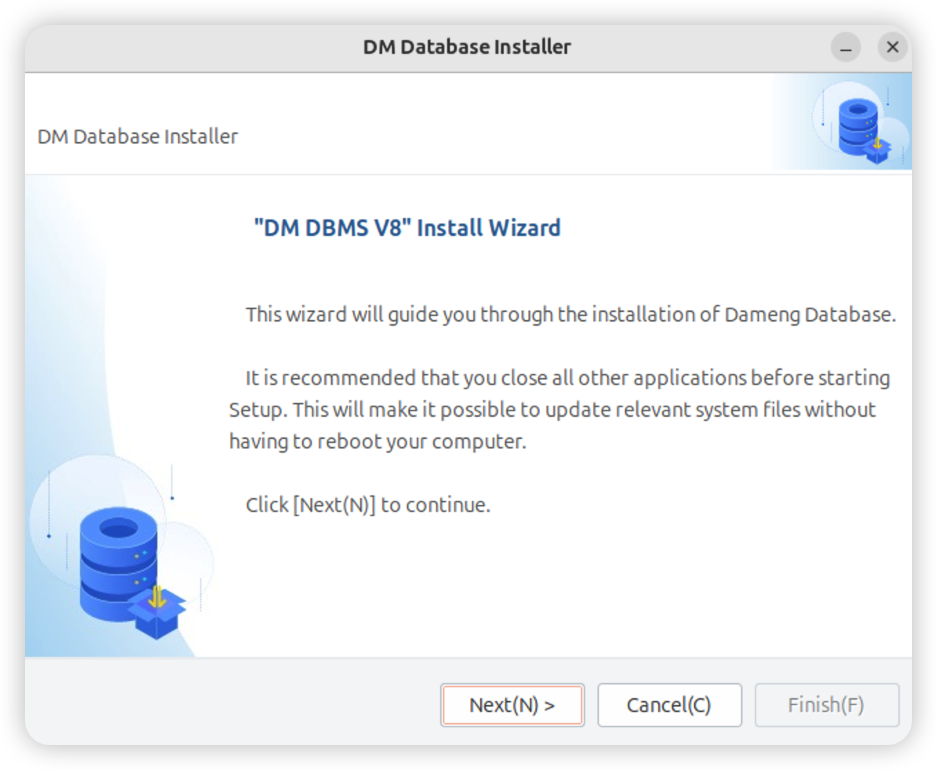 parallels@ubuntu-linux-2404:~$ ./DMInstall.bin -iInstaller Language: [1]: 简体中文[2]: EnglishPlease select the installer's language [2]:2Extract install files..........Hardware architecture verification passed!time(seconds) unlimitedfile(blocks) unlimiteddata(kbytes) unlimitedstack(kbytes) 8192coredump(blocks) 0memory(kbytes) unlimitedlocked memory(kbytes) 250376process 7355nofiles 1024vmemory(kbytes) unlimitedlocks unlimitedrtprio 0The max number of open files is too little, suggest to set 65536 or more to number of open files.Welcome to DM DBMS InstallerWhether to input the path of Key File? (Y/y:Yes N/n:No) [Y/y]:nWhether to Set The TimeZone? (Y/y:Yes N/n:No) [Y/y]:yTimeZone:[ 1]: (GTM-12:00) West Date Line[ 2]: (GTM-11:00) Samoa[ 3]: (GTM-10:00) Hawaii[ 4]: (GTM-09:00) Alaska[ 5]: (GTM-08:00) Pacific(America and Canada)[ 6]: (GTM-07:00) Arizona[ 7]: (GTM-06:00) Central(America and Canada)[ 8]: (GTM-05:00) East(America and Canada)[ 9]: (GTM-04:00) Atlantic(America and Canada)[10]: (GTM-03:00) Brasilia[11]: (GTM-02:00) Middle Atlantic[12]: (GTM-01:00) Azores[13]: (GTM) Greenwich Mean Time[14]: (GTM+01:00) Sarajevo[15]: (GTM+02:00) Cairo[16]: (GTM+03:00) Moscow[17]: (GTM+04:00) AbuDhabi[18]: (GTM+05:00) Islamabad[19]: (GTM+06:00) Dakar[20]: (GTM+07:00) BangKok,Hanoi[21]: (GTM+08:00) China[22]: (GTM+09:00) Seoul[23]: (GTM+10:00) Guam[24]: (GTM+11:00) Solomon[25]: (GTM+12:00) Fiji[26]: (GTM+13:00) Nukualofa[27]: (GTM+14:00) KiribatiPlease Select the TimeZone [13]:21Installation Type:1 Typical2 Server3 Client4 CustomPlease Input the number of the Installation Type [1 Typical]:1Require Space: 2174MPlease Input the install path [/home/parallels/dmdbms]:Available Space:36GPlease Confirm the install path(/home/parallels/dmdbms)? (Y/y:Yes N/n:No) [Y/y]:yPre-Installation SummaryInstallation Location: /home/parallels/dmdbmsRequire Space: 2174MAvailable Space: 36GVersion Information: Expire Date: Installation Type: TypicalConfirm to Install? (Y/y:Yes N/n:No):y2025-12-20 04:36:06 [INFO] Installing DM DBMS...2025-12-20 04:36:07 [INFO] Installing BASE Module...2025-12-20 04:36:10 [INFO] Installing SERVER Module...2025-12-20 04:36:10 [INFO] Installing CLIENT Module...2025-12-20 04:36:13 [INFO] Installing DRIVERS Module...2025-12-20 04:36:17 [INFO] Installing MANUAL Module...2025-12-20 04:36:17 [INFO] Installing SERVICE Module...2025-12-20 04:36:18 [INFO] Move log file to log directory.2025-12-20 04:36:18 [INFO] Installed DM DBMS completely.Please execute the commands by root:/home/parallels/dmdbms/script/root/root_installer.shEndparallels@ubuntu-linux-2404:~$