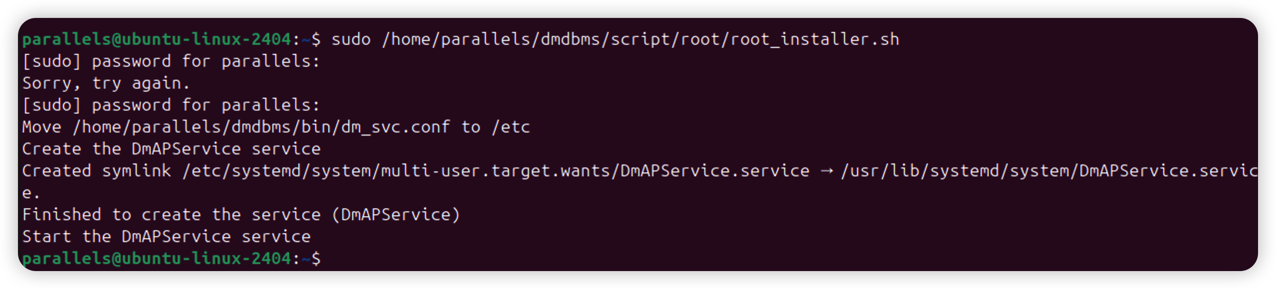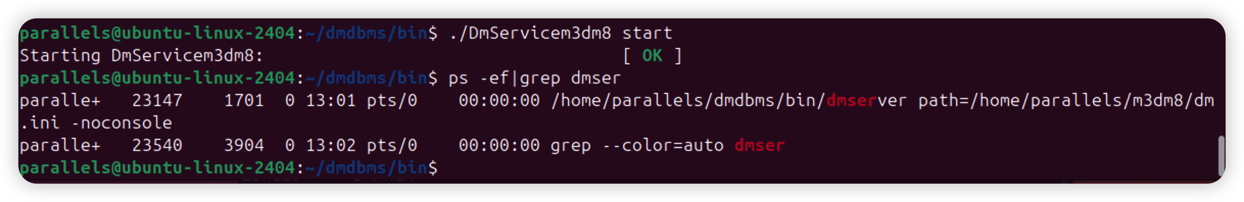 parallels@ubuntu-linux-2404:~/dmdbms/script/root$ sudo ./dm_service_installer.sh -t dmserver -p m3dm8 -dm_ini /home/parallels/m3dm8/dm.iniCreated symlink /etc/systemd/system/multi-user.target.wants/DmServicem3dm8.service → /usr/lib/systemd/system/DmServicem3dm8.service.Finished to create the service (DmServicem3dm8)parallels@ubuntu-linux-2404:~/dmdbms/script/root$