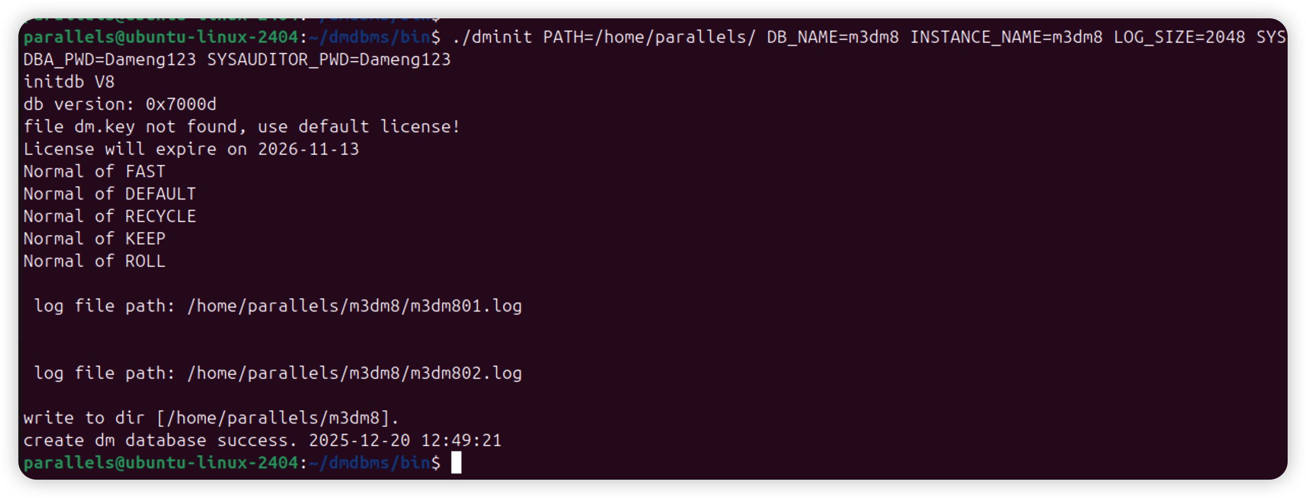 ./dminit PATH=/home/parallels/ DB_NAME=m3dm8 INSTANCE_NAME=m3dm8 LOG_SIZE=2048 SYSDBA_PWD=Dameng123 SYSAUDITOR_PWD=Dameng123