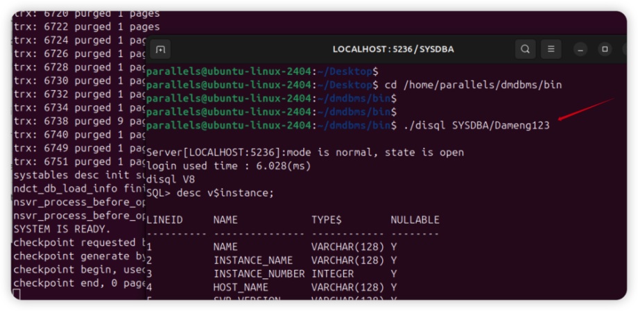 parallels@ubuntu-linux-2404:~/dmdbms/bin$ ./disql SYSDBA/Dameng123Server[LOCALHOST:5236]:mode is normal, state is openlogin used time : 6.337(ms)disql V8SQL> select * from v$version;LINEID BANNER ---------- ---------------------------------1 DM Database Server 64 V82 DB Version: 0x7000d3 03134284458-20251113-301923-201784 Msg Version: 15 Gsu level(5) cnt: 102used time: 2.247(ms). Execute id is 65501.SQL>