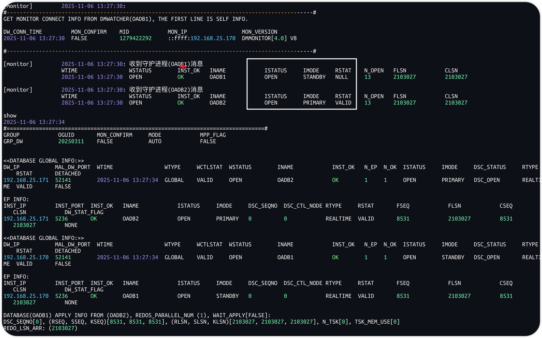 [dmdba@dmdrs-192-168-25-173 bin]$ ./dmrman CTLSTMT="RESTORE DATABASE '/dmdata/OADB/dm.ini' FROM BACKUPSET '/dmdata/bakfull_20250318'"dmrman V8RESTORE DATABASE '/dmdata/OADB/dm.ini' FROM BACKUPSET '/dmdata/bakfull_20250318'file dm.key not found, use default license![Percent:100.00%][Speed:0.00M/s][Cost:00:00:02][Remaining:00:00:00] restore successfully.time used: 00:00:02.491[dmdba@dmdrs-192-168-25-173 bin]$ ./dmrman CTLSTMT="RECOVER DATABASE '/dmdata/OADB/dm.ini' FOR STANDBY FROM BACKUPSET '/dmdata/bakfull_20250318'"dmrman V8RECOVER DATABASE '/dmdata/OADB/dm.ini' FOR STANDBY FROM BACKUPSET '/dmdata/bakfull_20250318'file dm.key not found, use default license!==============================Error Stack==============================DM[603]:备份集[/dmdata/bakfull_20250318]备份过程中未产生日志=======================================================================recover successfully!time used: 358.671(ms)[dmdba@dmdrs-192-168-25-173 bin]$ ./dmrman CTLSTMT="RECOVER DATABASE '/dmdata/OADB/dm.ini' UPDATE DB_MAGIC"dmrman V8RECOVER DATABASE '/dmdata/OADB/dm.ini' UPDATE DB_MAGICfile dm.key not found, use default license!recover successfully!time used: 00:00:01.083[dmdba@dmdrs-192-168-25-173 bin]$