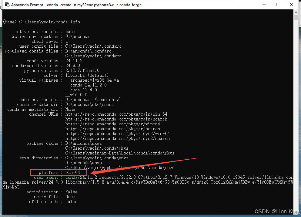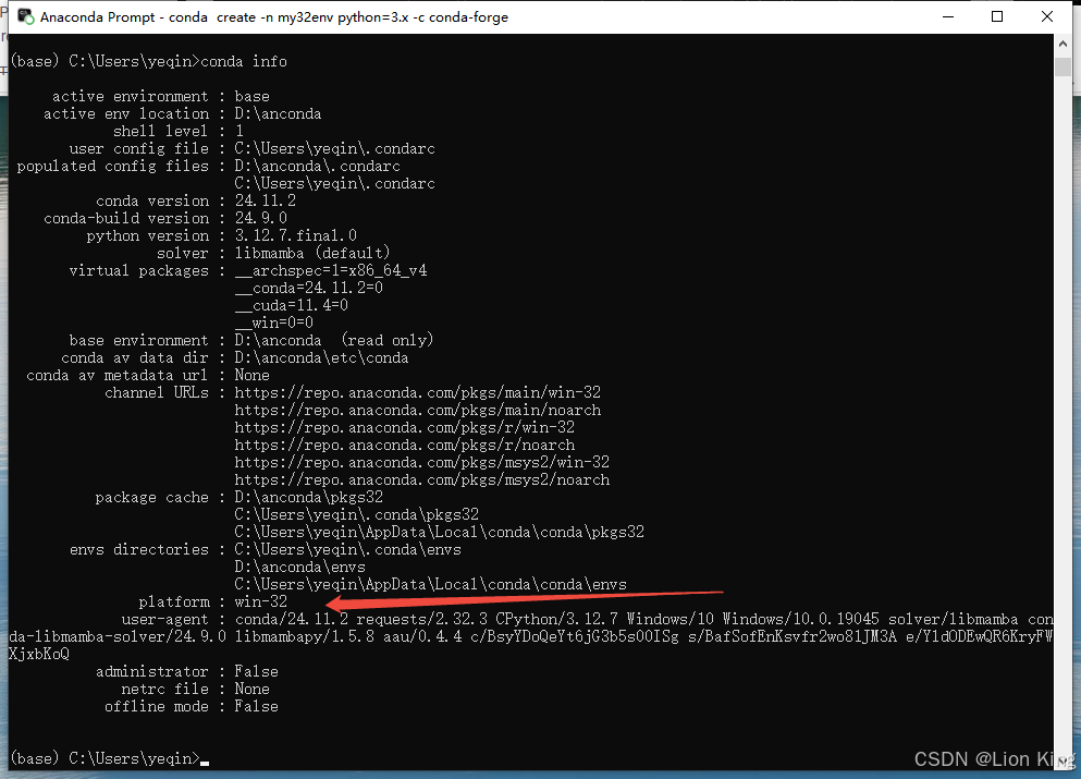 # 1. 注意,需要先切换到 32 位平台,指定 Python 版本(如 python=3.x),并创建虚拟环境到指定路径conda create --prefix "C:UsersyeqinDesktoppython32FfromCondamy32env" python -c conda-forge# 2. 激活环境(用完整路径更安全)conda activate "C:UsersyeqinDesktoppython32FfromCondamy32env"# 3. 验证 Python 版本和平台架构是否正确python --versionpython -c "import platform; print(platform.architecture())"python# 4. 安装额外包(如有需求)conda install pefile -c conda-forge# 5.使用32位python环境pythonexit()# 6. 退出32位虚拟环境conda deactivate# 7. 删除环境(注意使用完整路径删除)conda remove --prefix "C:UsersyeqinDesktoppython32FfromCondamy32env" --all