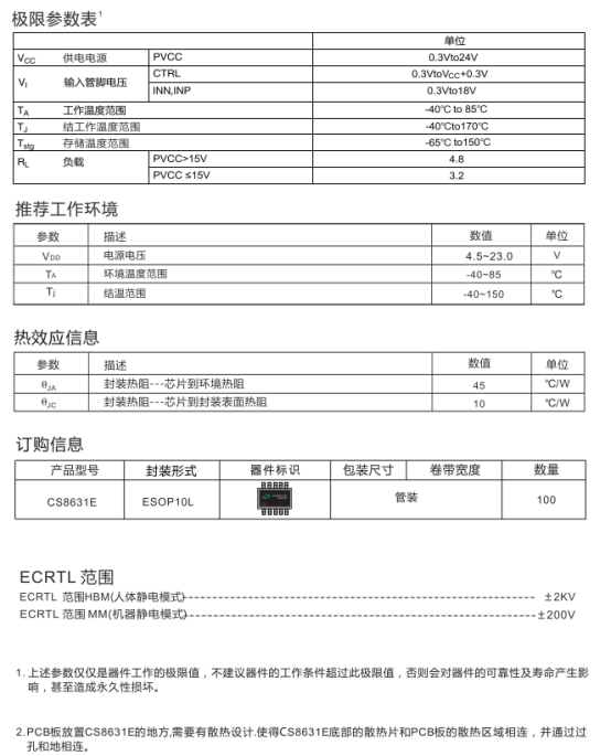 CS8631E是一款单声道D类音频功率放大器,专为AI音箱、家庭音响系统等需要高质量音频输出的设备设计,采用ESOP10L封装(底部带PGND散热片,管装100颗/管),工作环境温度-40℃~85℃,结温范围-40℃~150℃,热阻45℃/W,输入电压覆盖4.5~23V(极限耐压24V),转换效率高达92%,无需额外散热器即可稳定工作。