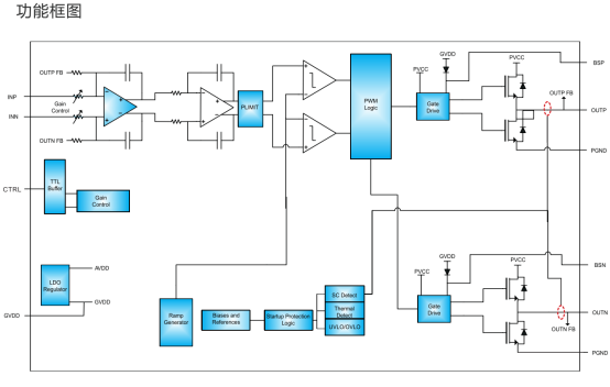 核心功能上,它具备扩频技术,当CTRL引脚电压在1.05~1.25V时开启,开关频率在315kHz±25kHz随机变化,可有效分散频谱能量降低EMI,输出端搭配廉价铁氧体磁珠或简单滤波组合(磁珠+1nF或10uH+1uF)即可通过FCC B级认证,实现免滤波设计。芯片采用40倍固定增益,内置16K输入电阻和640K反馈电阻,减少外围器件;支持差分输入和单端输入,差分输入能抑制共模噪声、避免开关机噗声,单端输入需注意阻抗匹配和布线。CTRL引脚还兼具多功能,高电平(≥2V)开启芯片,低电平(≤0.8V)进入待机模式,电压大于1.6V时关闭扩频模式,不可悬空,最高可接PVCC。
