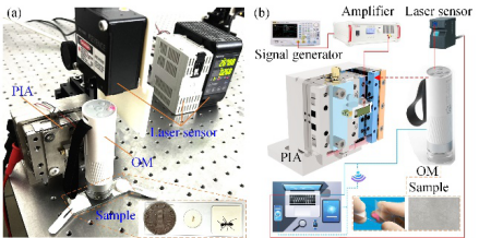 搭建实验系统进行输出特性研究,如上图所示。波形由信号发生器产生,并由功率放大器(Aigtek,ATA-3080)放大,之后对驱动器激励。激光传感器测量速度和位移,将实验数据传输到计算机。光学显微镜(OM)的行程一般在几十毫米左右。所研制样机具有长行程、高分辨率、自锁等优点,有望为自动光学显微镜成像提供解决方案。所搭建的光学显微系统配置如右图所示.显微镜用粘合剂粘在动子上。激光传感器安装在三维精密平台上,然后聚焦在显微镜的末端以测量其运动。光学显微系统用于生物和金相显微成像。与此同时,数据被传输至电子设备。