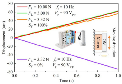 即使运动物体自重相当于1.35N(超过当前功的3.3倍)的负载推力下,双向位移线性拟合相关系数R2在重力辅助下也能达到0.9999。最大前进速度和分辨率分别达到304.73mm/s和5.3nm。这种新颖的设计思想特别适合Z自由度驱动,并已成功应用于显微成像。