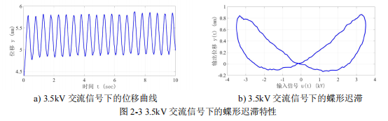 测试结果如图2-3所示。图2-3(a)为正弦驱动电压为3.5kV,1Hz条件下的介电弹性体驱动器输出位移实验结果,图2.3(b)为介电弹性体在该输入信号条件下的输入输出响应。由此,可以看出,介电弹性体在正弦驱动电压驱动下,体现出了与传统刚性智能材料驱动器中的单回路迟滞现象不同的双回路迟滞现象。图2-4(a)、图2-5(a)为正弦驱动电压为4.0kV,IHz和4.5kV,1Hz条件下的介电弹性体驱动器输出位移实验结果,图2-4(b)和图2-5(b)为介电弹性体在该输入信号条件下的输入输出响应。由此,可以很明显地看出,介电弹性体驱动器的蝶形迟滞现象在不同幅值驱动电压下呈现出了非线性变化。