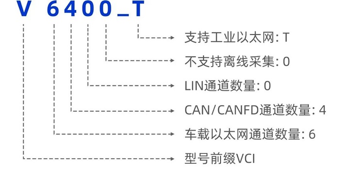 以TestBase V6400_T为示例进行解读,该型号支持6路车载以太网通道、4路CAN/CAN FD/CAN XL通道、0路LIN通道,不支持离线采集(第4位为0),后缀“T”表明其适配工业以太网场景。