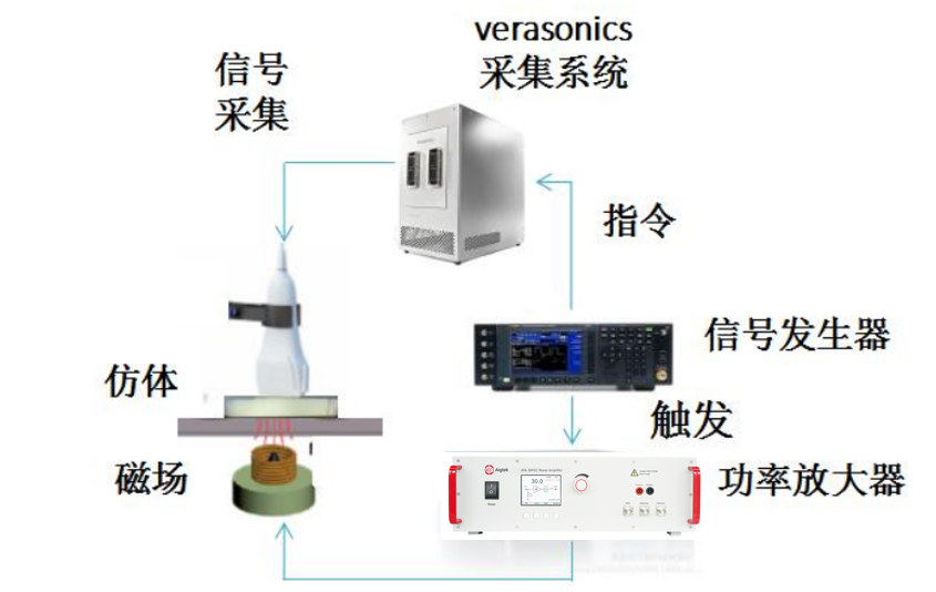 实验原理:在超声-电磁耦合弹性成像实验中,激励模块通过“电信号生成-放大-磁场转换”的链式反应驱动磁纳米粒子振动:函数发生器产生特定波形的电信号,经功率放大器适度放大后输入激励线圈,线圈将电信号转化为脉冲磁场,促使磁纳米粒子受磁致作用产生振动并激发周围组织的剪切波。功率放大器在此过程中作为信号放大的关键节点,其作用是确保激励线圈获得足够强度的驱动电流,从而生成满足实验要求的脉冲磁场(如300mT),为磁纳米粒子的有效振动及后续剪切波的超声检测提供必要的激励条件。该过程通过跨物理场耦合(电-磁-声)实现对组织弹性信息的间接获取,功率放大器的应用保障了激励信号的能量输出,是连接电信号与磁场激励的重要环节,支撑了磁致振动效应的触发与剪切波传播的激发。