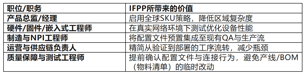 对开发新型物联网产品或扩展互联产品线的工程师,IFPP提供了关键的早期工具集。通过跨职能协作,IFPP成为连接产品、质量与生产团队的协同枢纽,显著降低量产转型期的决策风险。