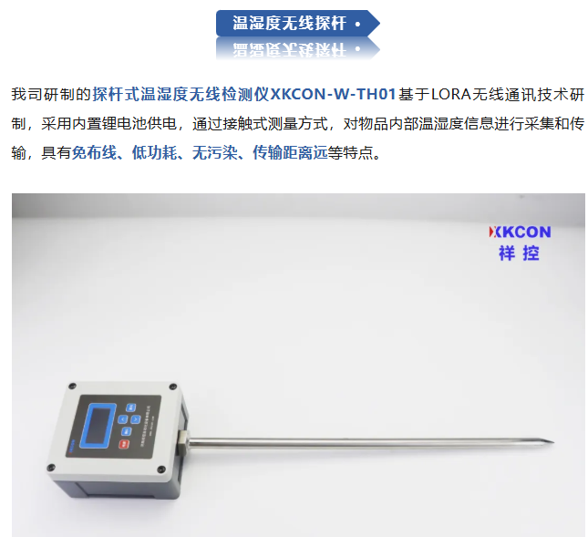 基于LORA无线通讯和内置锂电池供电的XK-W-TH01型温湿度探杆,无需复杂的布线工作,缩短了工期,节省了成本,林灵活性强,企业可根据农业堆肥发酵要求灵活配置,实现对堆肥分布式、多点式的温湿度信息采集接收,提升了企业对农业堆肥发酵的监测和防控能力。
