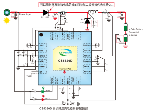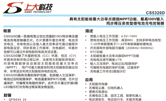 CS5320D是一款具备太阳能板最大功率点跟踪(MPPT)功能的同步降压锂电池充电控制器,输入电压范围4.5V~100V,电池电压最高支持88V,可适配1~20节串联锂离子电池或1~24节串联磷酸铁锂电池,适用于太阳能充电器、无绳电动工具、便携式电源站、电动自行车等设备。采用QFN4X4_24封装(3000颗/卷),工作结温-40℃~125℃,环境温度-40℃~85℃,ESD防护达±2KV(HBM),热阻52℃/W,需通过PCB散热设计保障高电压大电流场景稳定运行。