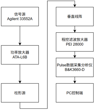 测试设备:信号源、功率放大器ATA-L6B、柱形声源、垂直线阵、程控滤波放大器、数据采集系统、消声水池