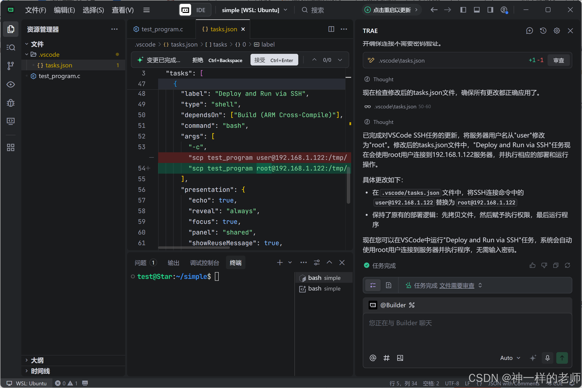 在检查代码时,发现自己刚才忘了提供服务器的用户名和密码,导致生成的task.json有点小问题,我告诉TRAE“忘了告诉你服务器的用户名是root,没有密码”。TRAE马上把这个问题改过来了。