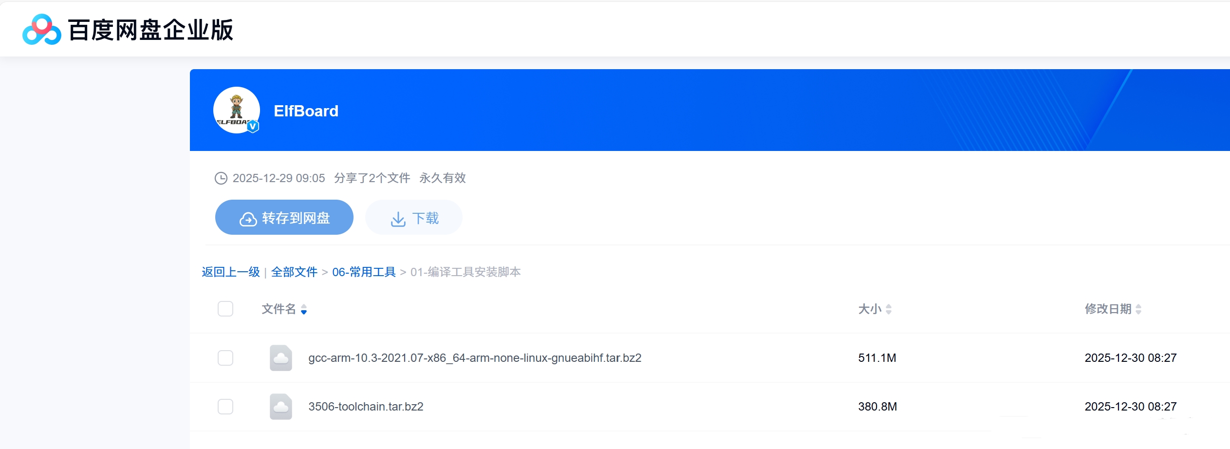 厂商提供了用于编译的VMWare环境,不过我没有用,还是喜欢使用Windows自带的WSL2。下面介绍一下如何配置WSL编译环境。首先从厂商的资料云盘上下载两个软件包:https://www.elfboard.com/information/detail.html?id=8