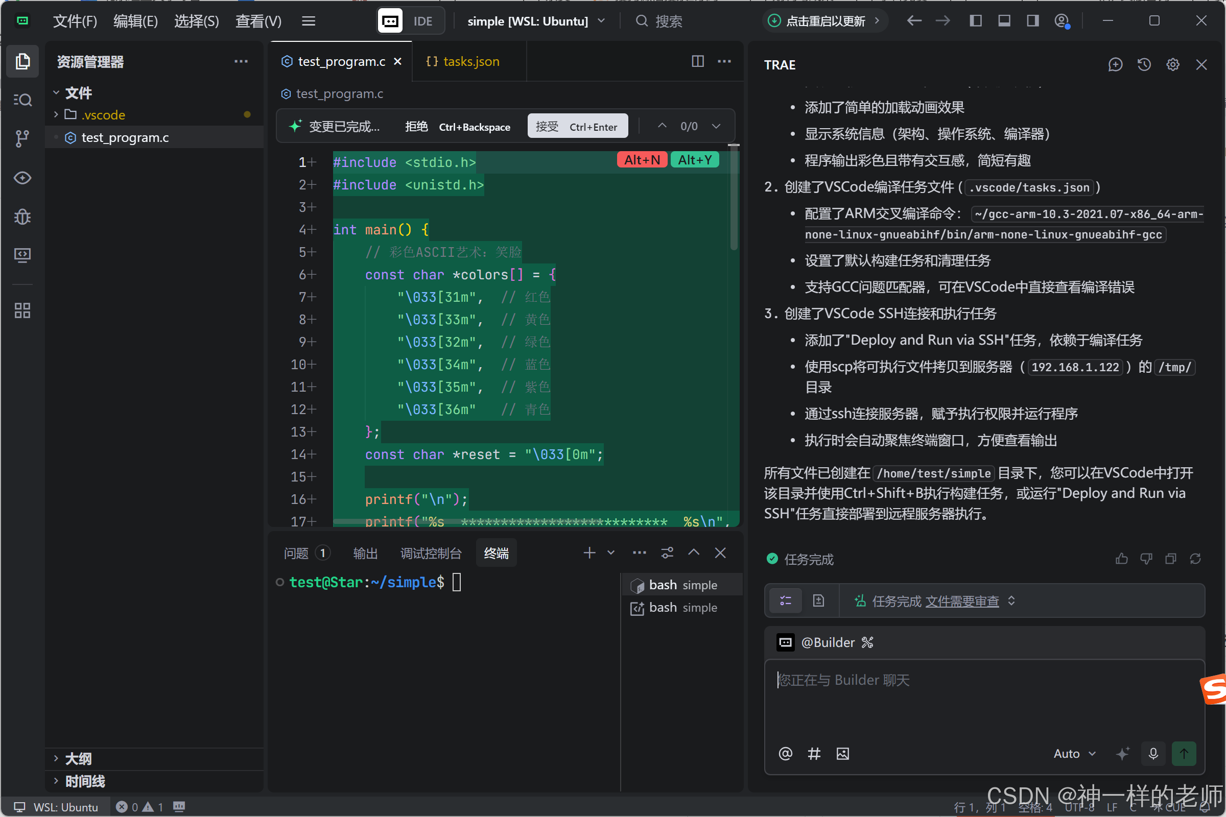 TRAE开始勤奋的工作,开始生成C程序代码(test_program.c)和任务代码(task.json)。