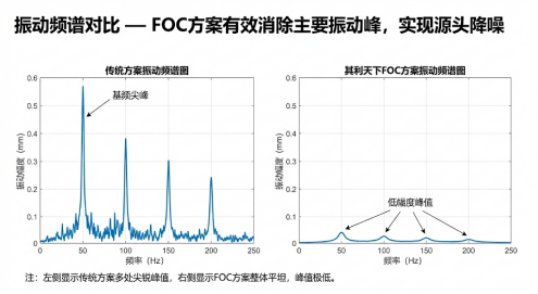下图对比了传统方案(左)与我们FOC方案(右)在相同工况下的运行振动频谱。可见,FOC方案将突出的振动能量峰值彻底抹平,转化为平顺的背景噪声。
