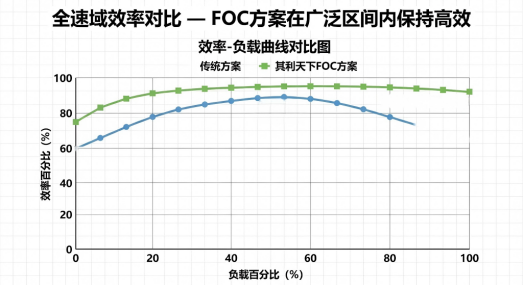 下图展示了两种方案的效率-负载曲线对比。我们的FOC方案(蓝色曲线)在整个区间内都维持在高位平台,尤其在常用部分负载区间,效率优势超过15%。