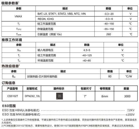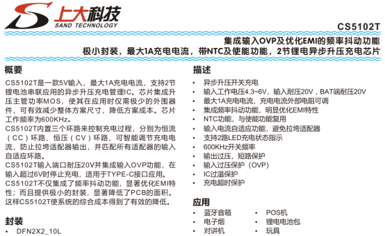 CS5102T是一款专为2节锂电池串联设计的异步升压充电管理芯片,输入工作电压4.3~5.5V(耐压20V),最大充电电流1A,适用于蓝牙音箱、POS机、电子烟、锂电电池包等设备。采用极小的DFN2X2_10L封装,工作开关频率600KHz,集成升压主管功率MOS,外围器件需求少,能有效减小方案尺寸与成本,ESD防护性能可靠。