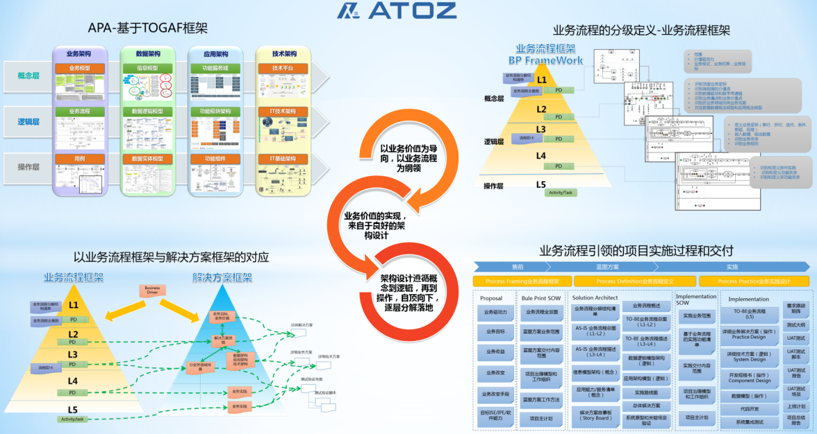 概念层(L1-L2):通过流程分解结构(PDS)和全景图,明确业务模式和价值驱动因素。