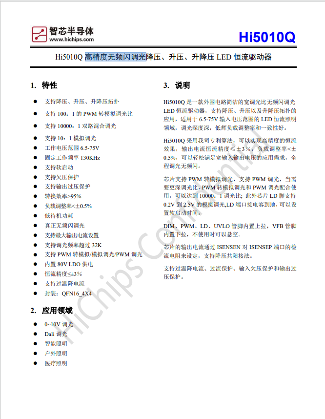 Hi5010Q 采用高度集成架构,外围电路仅需少量元器件即可实现降压、升压及升降压拓扑,大幅简化系统设计。6.5-75V 宽输入电压范围覆盖多数工业与商用照明场景,支持多串LED灵活配置,适配从低压景观灯到高压商业照明的多样化需求。