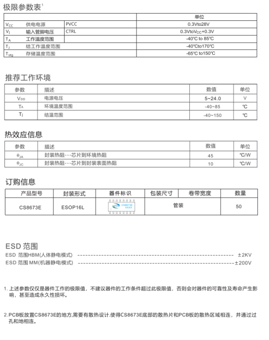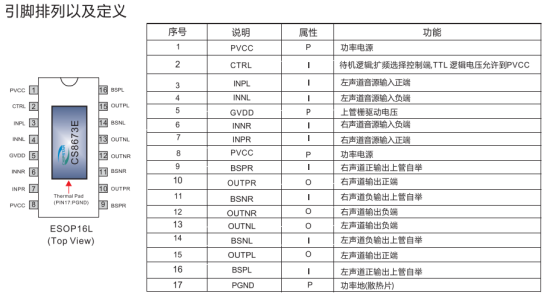 CS8673E是一款高效D类音频放大器,输入电压5~26V,支持立体声和单声道PBTL两种工作模式,适用于LCD电视、家庭音响系统等设备。采用ESOP16L封装(管装50颗/管),工作环境温度-40℃~85℃,结温范围-40℃~150℃,ESD防护达±2KV(HBM),转换效率高达92%,无需额外散热器即可稳定工作。