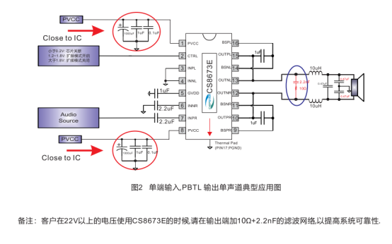 核心功能丰富实用,内置扩频功能,CTRL引脚电压在1.2~1.8V时开启,开关频率在300KHz±30KHz随机变化,有效降低EMI,输出端搭配廉价铁氧体磁珠即可满足EMC要求,实现免滤波设计。固定24倍增益,内部集成15K输入电阻和360K反馈电阻,减少外围器件;支持差分输入(抗共模噪声、开关机无噗声)和单端输入(适配多数主芯片,需注意阻抗匹配和布线),还具备PBTL单声道模式,将INNL、INPL管脚接地即可切换,适配高功率单声道场景。