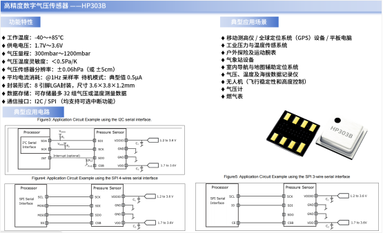 例如,华普微自主研发的HP303B就是一款采用电容式传感元件,可同步实现气压与温度双参数测量,兼具低功耗、高精度特性的数字气压传感器。