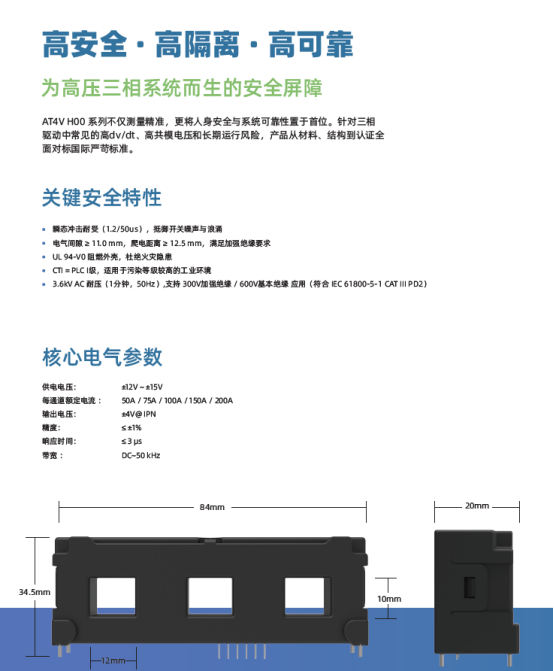 量程匹配:根据电机最大相电流(包括过载能力)选择传感器型号,如AT4V100对应±100A额定值。