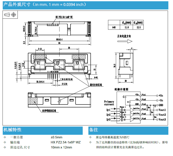 原边结构:传感器壳体上有三个独立的矩形开孔,分别对应三相输入。每相母排穿过对应孔时,其电流产生的磁场被该通道专用的磁芯与霍尔元件感知。