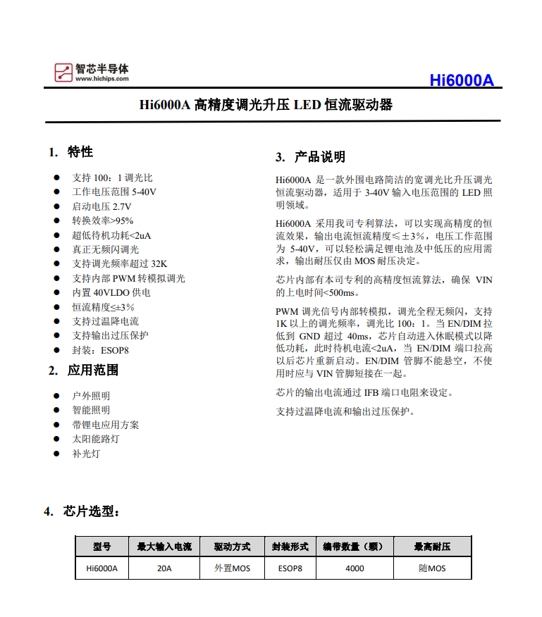 Hi6000A 高精度调光升压 LED 恒流驱动器重磅登场,以全维度硬核参数突破行业瓶颈,兼顾精准控光、高效节能与稳定可靠,成为多场景照明方案的核心优选,赋能户外照明、智能照明、锂电供电及太阳能照明等领域提质升级。