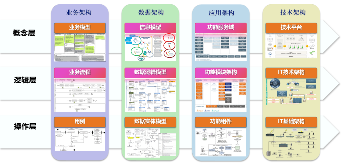 图一:架构指导框架(怎么分类?) 这就像一个书架。横向看,它分四个架构:业务、数据、应用、技术。纵向看,它分三个层面:概念、逻辑、操作。这样就把复杂的转型工作切分成了12个小格子,每个格子都有明确的任务。