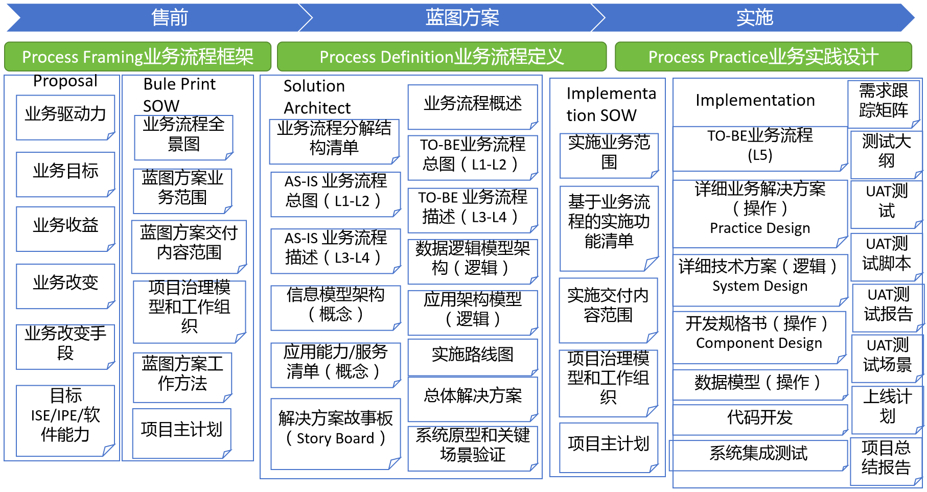 这是一张时间表。它规定了项目从售前、到蓝图设计、再到实施上线的全过程。每个阶段该交什么文档,该做什么测试,都规定得清清楚楚。