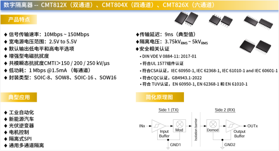 CMT812X、CMT804X、CMT826X是一系列具备不同通道数与方向配置的标准数字隔离器。
