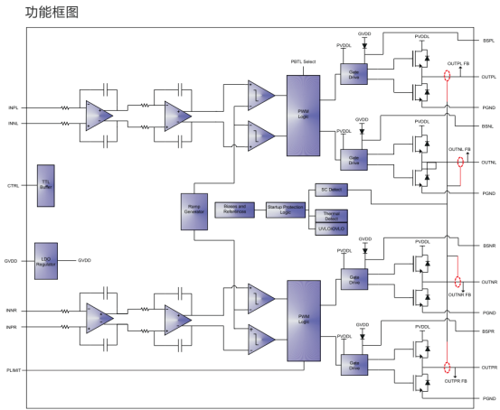 核心功能丰富实用,固定40倍增益,内部集成16K输入电阻和640K反馈电阻,减少外围器件;支持扩频功能,CTRL引脚电压在1.1~1.25V时开启,开关频率在300KHz±30KHz随机变化,可分散频谱能量降低EMI;具备功率限制功能,通过PLIMIT引脚电压设定最大输出功率,电压越高允许输出功率越大,需在该引脚到地添加1uF电容稳定;支持差分输入,抗共模噪声能力强,开关机无噗声,输出管脚布局方便布线。