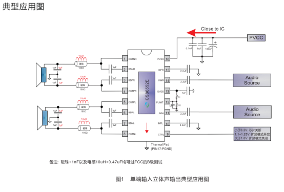 CS86552E是一款带扩频功能的2×20W立体声D类音频放大器,采用EQA16封装(底部带GND散热片),工作环境温度-40℃~85℃,结温范围-40℃~125℃,适用于LCD电视、家庭音响系统等设备。效率高达90%,无需额外散热器,输出端搭配廉价磁珠或简单LC滤波(磁珠+1nF或10uH+0.47uF)即可通过FCC B级测试,EMC性能优异,能有效节省PCB面积与方案成本。