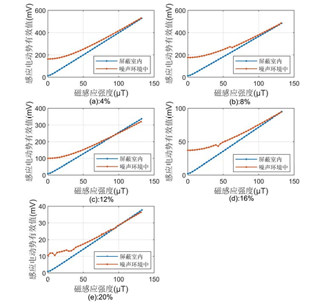 图3:不同MWCNTs质量百分比本征柔性磁敏元件在噪声环境中与在屏蔽室内的输出特性曲线图