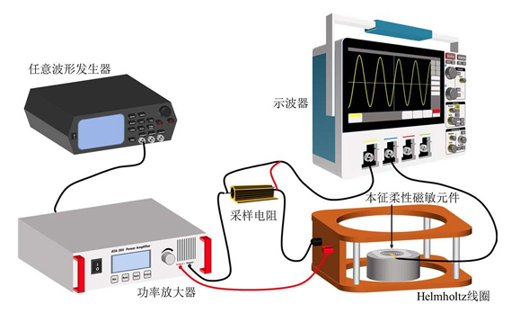 测试设备:Helmholtz线圈、任意波形发生器、ATA-304功率放大器、示波器、采样电阻、本征柔性磁敏元件。