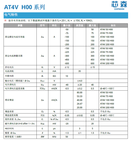 宽电流覆盖:提供50A至200A额定型号(IPN),对应测量范围±150 A至±600 A(IPM),可覆盖10kW级变换器需求(如AT4V 50 H00支持±150A过载);