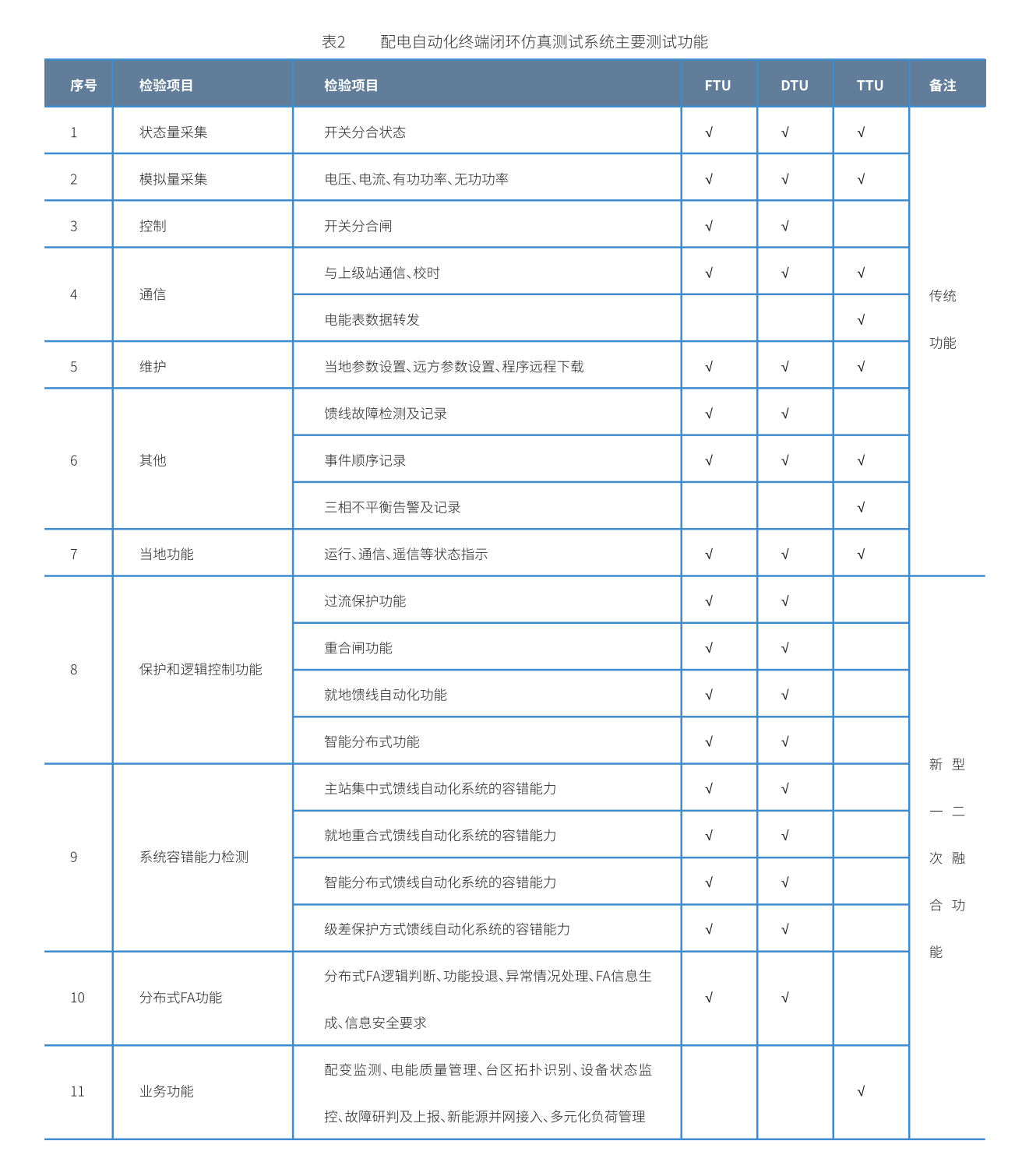 参考如表3-1所示已经发布的相关标准和《配电物联〔2020〕5号-关于发布《台区智能融合终端相关技术规范》的通知》等,科瑞杰配电自动终端闭环仿真测试系统可开展的主要测试功能如表3-2所示。