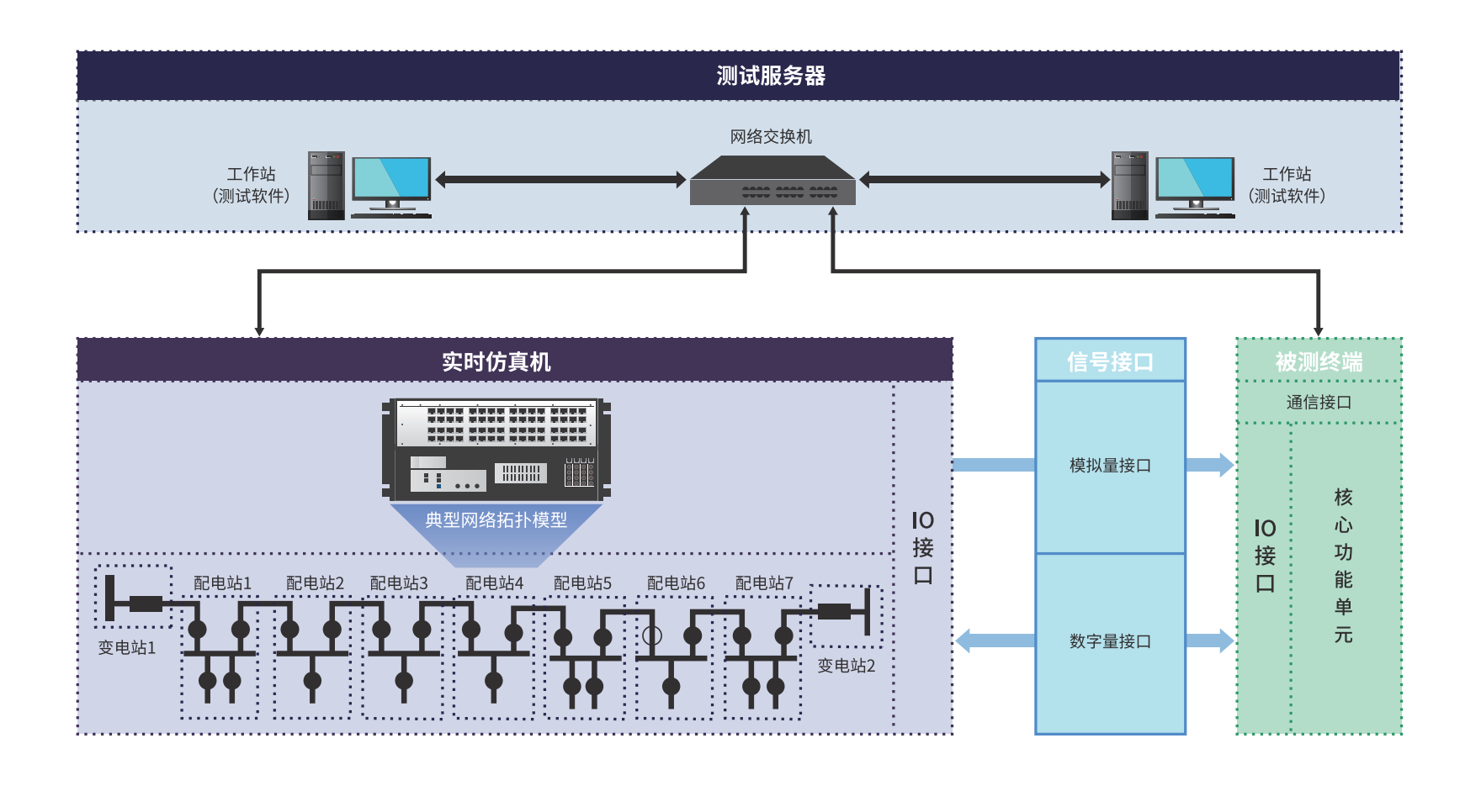 科瑞杰配电自动化终端闭环仿真测试系统主要由测试服务器(包含网络交换机、工作站、位于工作站中的测试软件)、实时仿真机(包含实时仿真运行的典型网络拓扑模型、仿真机处理器和IO接口)、信号接口(包含模拟量接口、数字量接口)、被测配电自动化终端设备等组成。