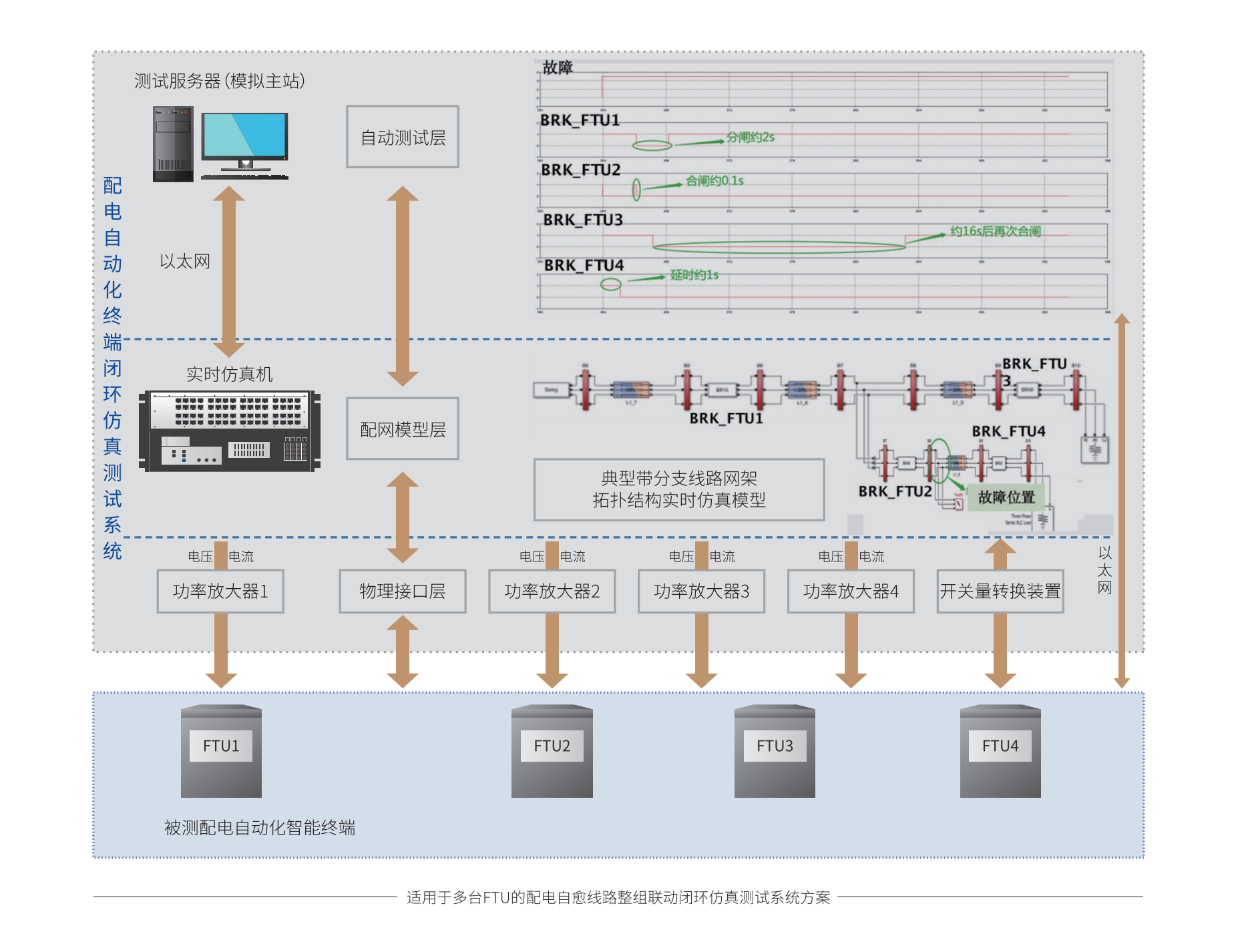 项目概况:配电自动化馈线终端主要对柱上中压开关进行监控,完成遥测、遥信、遥控等功能,实现故障定位、故障隔离和非故障区域快速恢复供电,其对配电网系统稳定运行起到重要作用。为解决海量配网自动化终端以及配电网自愈馈线的整组联动测试问题,提升配电自愈线路整组测试水平,提出了“典型配电网潮流仿真+硬件在环接入多台配电自动化终端”的闭环仿真测试系统解决方案。