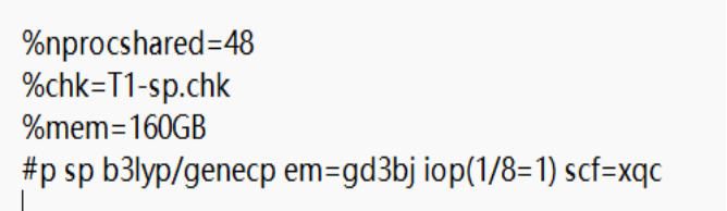 1、第一行—第三行是关于核数、内存、chk文件路径设置,这里我们重点是第四行的内容其中,genecp是高斯自定义基组的关键词(含赝势基组的自定义关键词),如果没有这个关键词高斯不会识别到自定义基组内容。