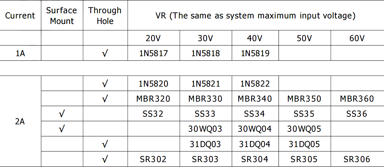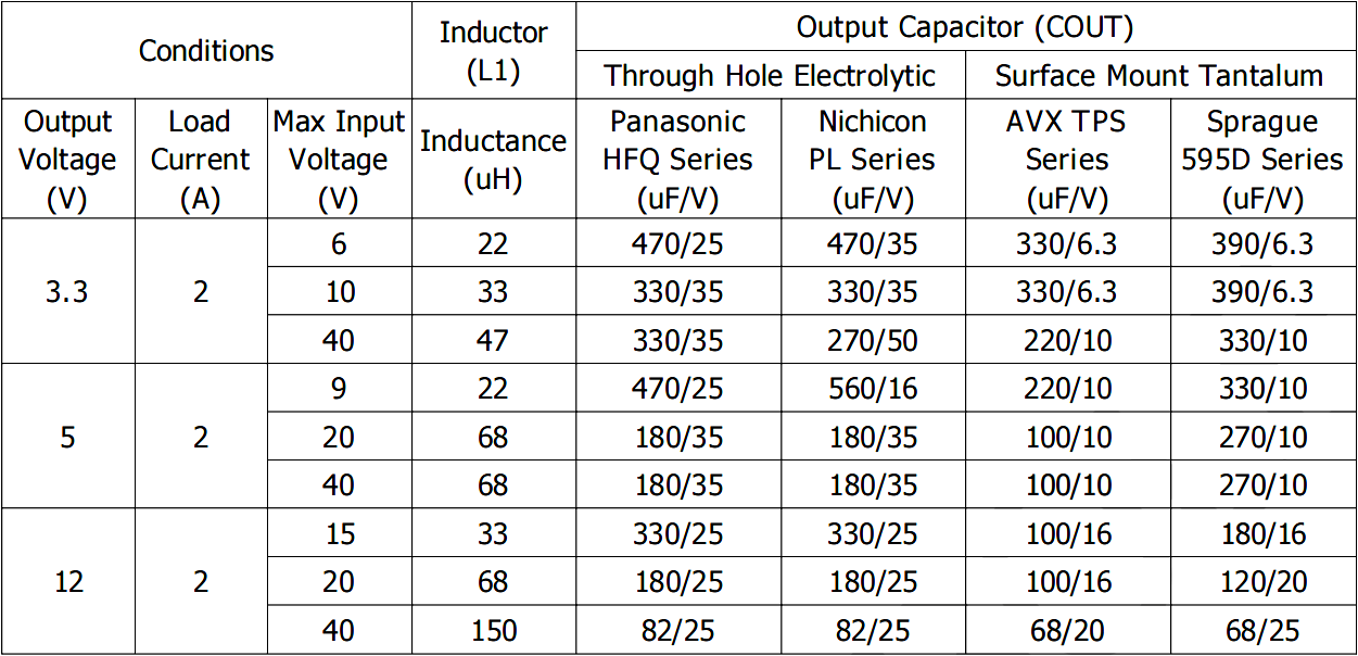 上图为肖特基二极管选型表以及输入/输出电容选型表(分固定输出与可调输出版本),工程师可根据实际输入输出电压、电流需求及温度环境进行选择。