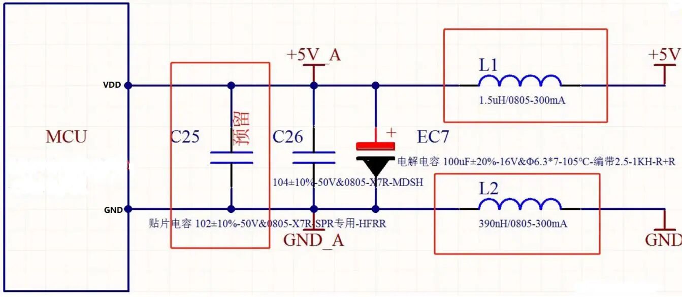 在芯片的电源端口加100uf电解电容和100nf滤波电容,同时预留1nF滤高频电容,这些电容尽量靠近芯片电源引脚,其中电解电容建议采用高频低阻材质。